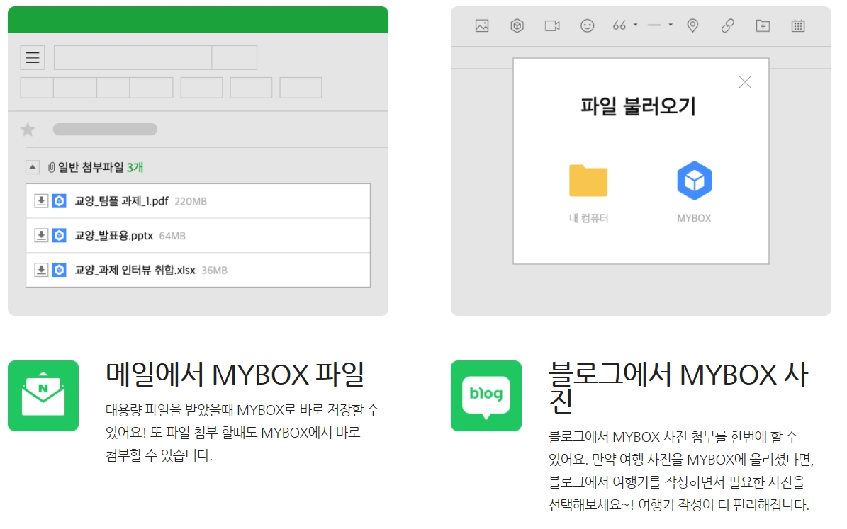 마지막으로 메일이나 블로그에서도 대용량 파일을 첨부하고 저장할 수 있다는 점이 문서작성을 매우 편리하게 하는 장점이 될 수 있겠네요. 지금까지 네이버 클라우드(마이박스) PC다운로드 방법 및 이용법, 장점을 알아봤습니다. 네이버에서 제공하는 서비스이기 때문에 모든 그림의 출처는 네이버입니다.
