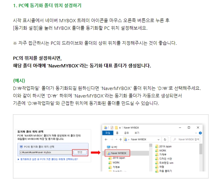 먼저 시작표시줄에서 네이버 마이박스 트레이아이콘을 마우스 오른쪽 버튼으로 클릭한 뒤 동기화 설정을 눌러 동기화할 PC의 위치를 지정해줍니다. 상단의 그림처럼 PC의 위치를 설정하면 해당폴더아래에 네이버 마이박스라는 동기화 대표 폴더가 생성!