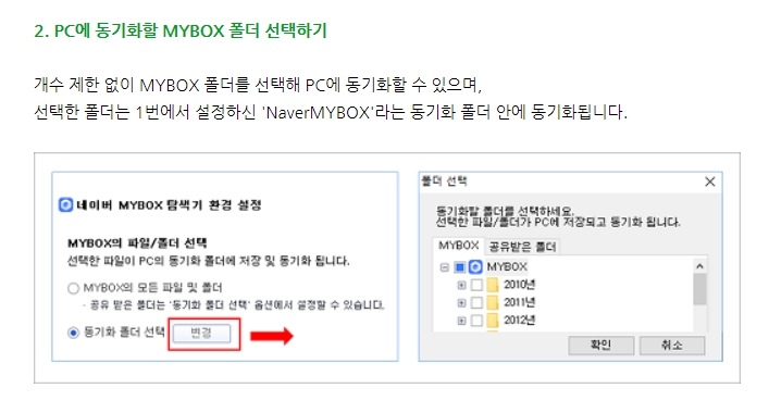 마이박스폴더는 개수제한없이 PC에 동기화할 수 있는데 선택한 폴더는 앞서 1번에서 설정한 네이버마이박스 폴더 안에 동기화됩니다.