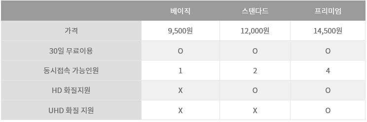 넷플릭스는 요금제로 운영되는데요. 베이직, 스탠다드 그리고 프리미엄 이렇게 3가지 중 하나로 가입한 뒤 시청할 수 있습니다. 베이직은 한달 9,500원이며 1인용입니다. 따라서 동시에 여러명이 한 아이디로 접속하지 못하며 다른 요금제보다 저렴한 대신 HD보다 떨어지는 화질로 감상해야합니다. 스마트폰으로 보기에도 화질이 조금 떨어지는 게 느껴질 정도라고 생각하시면 될 것 같습니다. 두 번째로 스탠다드는 월 12,000원입니다. 2인용으로 동시에 2명까지 접속가능합니다. 기본화질은 베이직보다 한 단계 업그레이드된 HD화질이며 이는 스마트폰 뿐 아니라 태블릿에서도 깔끔하고 선명한 화질로 감상을 용이하게 합니다. 마지막은 프리미엄인데 프리미엄은 월 14,500원입니다. 4인용(한 아이디에 계정 프로필 4개 생성), 즉 한 번에 4명이 한 아이디로 접속이 가능하며 가장 비싼 요금제인만큼 UHD화질을 지원합니다. 혼자 9,500원씩 월마다 결제해서 보는 것보다14,500원을 4명이서 나눠내면 더욱 저렴한 가격, 좋은 화질로 감상할 수 있기 때문에 정말 많은 분들이 4인 지원되는 프리미엄을 이용하고 있습니다.