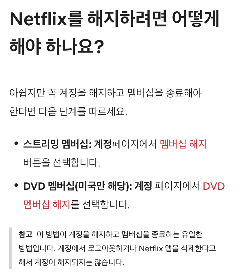 그렇다면 넷플릭스 해지는 어떻게 해야할까요? 보통 스트리밍 멤버십의 경우 로그인 한 상태에서 계정에 들어간 뒤 멤버십 해지버튼을 선택하면 쉽고 빠르게 해지가 가능합니다. 미국의 경우엔 DVD멤버십해지 옵션까지 있네요. 넷플릭스 측에선 이 방법이 계쩡을 해지하고 멤버십을 종료하는 유일한 방법이라고 말합니다. 계정에서 로그아웃하거나 넷플릭스 앱을 삭제하는 것은 계정해지의 방법이 절대 아님을 유의하시기 바랍니다. 모바일에서도 해지가 가능한데 이 때 앱이 아닌 사파리에서 직접 netflix.com으로 들어가 로그인을 한 뒤 계정에 들어가 멤버쉽 해지를 하면 됩니다. 포털 사이트에서 '넷플릭스'를 검색해서 들어가면 바로 앱으로 연동되니 주소창에 직접 넷플릭스 주소를 입력해야 한다는 점 주의하세요!