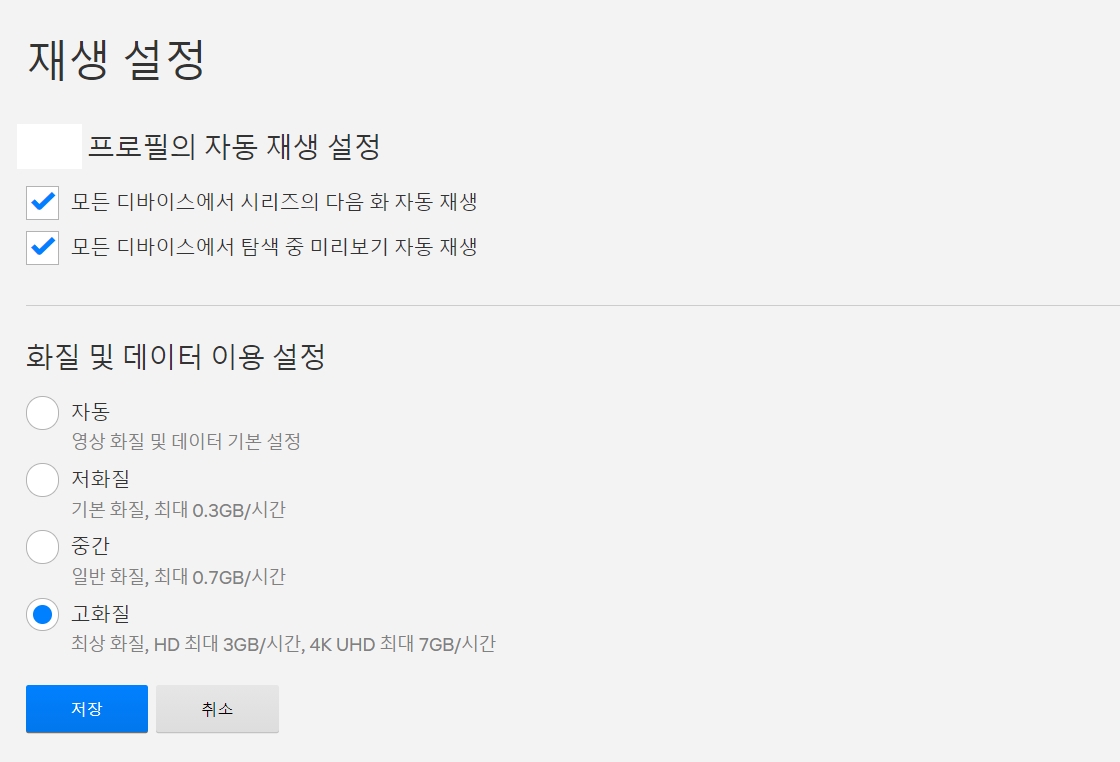 PC에서 넷플릭스 화질설정을 하고자 하는 분들은 넷플릭스 메인에서 오른쪽 상단 위 프로필 계정을 클릭한 뒤 '프로필 & 자녀 보호 설정' 탭에서 본인 프로필 가장 아래에 있는 재생 설정으로 들어갑니다. 하단의 화질 및 데이터 이용 설정에 '자동'으로 되어있을 확률이 큰데 '고화질'로 클릭 후 저장을 누르면됩니다. 참고로 넷플릭스 프로그램을 보는 도중엔 자막, 음성, 재생속도는 설정할 수 있으나 화질설정은 따로 설정할 수 없으니 메인으로 나온 뒤 설정하셔야 합니다.
