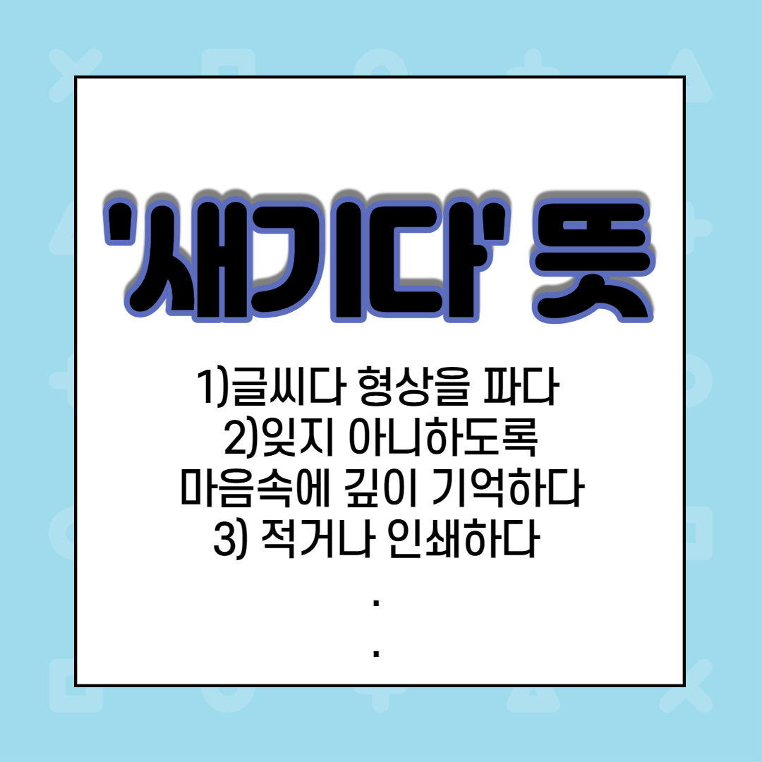 먼저 '새기다'의 뜻은 1)글씨다 형상을 파다, 2)잊지 아니하도록 마음속에 깊이 기억하다, 3) 적거나 인쇄하다 4)글이나 말의 뜻을 알기 쉽게 풀이하다 5)다른 나라의 말이나 글을 우리말로 번역하여 옮기다 라는 뜻이 있습니다. 따라서 예시를 들어보면 비석에 비문을 새기다, 몸에 문신을 새기다, 다짐을 마음에 새기다, 도장을 새기다, 글자를 새기다 등으로 쓰일 수 있습니다.