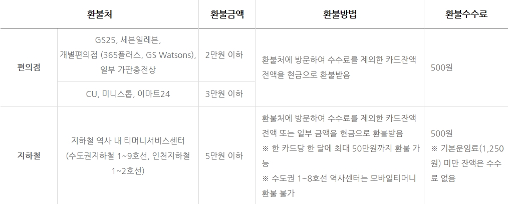 3) (주)티머니 본사 1층을 방문 : 1인 1일 최대 50만원 환불가능. 5만원 이상 환불 요청 시 신분증(이름, 생년월일)과 연락처 확인.10만원 이상 고액환불의 경우 내방 당일 카드잔액 차감 후 익일 18시 이후 계좌 입금(주말/공휴일 제외).