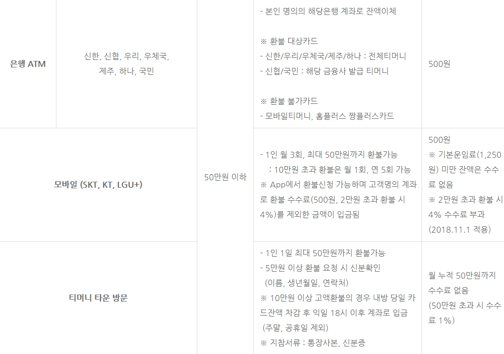 - 잔액이 5만원을 초과하는 경우, 티머니 본사로 내방 or 환불기능있는 ATM에서 해당은행 계좌로 환불가능.(단, 모바일티머니,홈플러스(짱플러스)카드, 보급형카드는 ATM에서 환불불가)